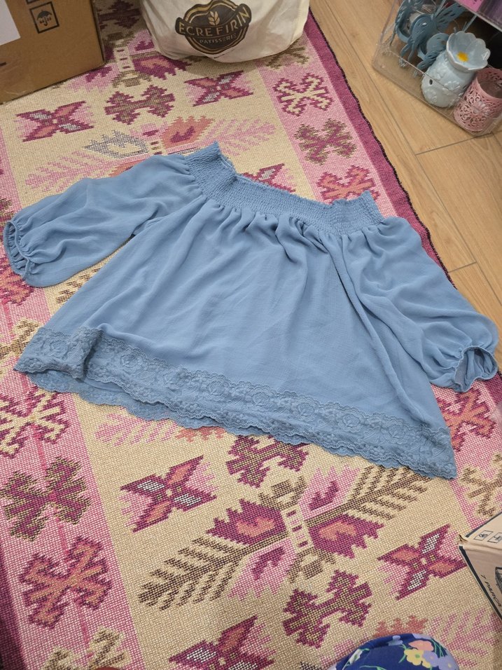 Dantel detaylı, uzun kollu, tekne yaka mavi bluz. Bohem tarzda, nakışlı deseni ve rahat kesimiyle günlük kullanıma uygun.