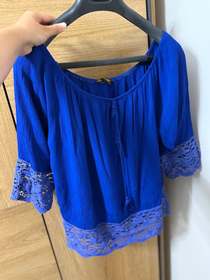 Mavi pamuklu, bol kesim, kısa kollu, kayık yaka bluz. Kollarda ve etek ucunda dantel detayları bulunan bohem tarzı.