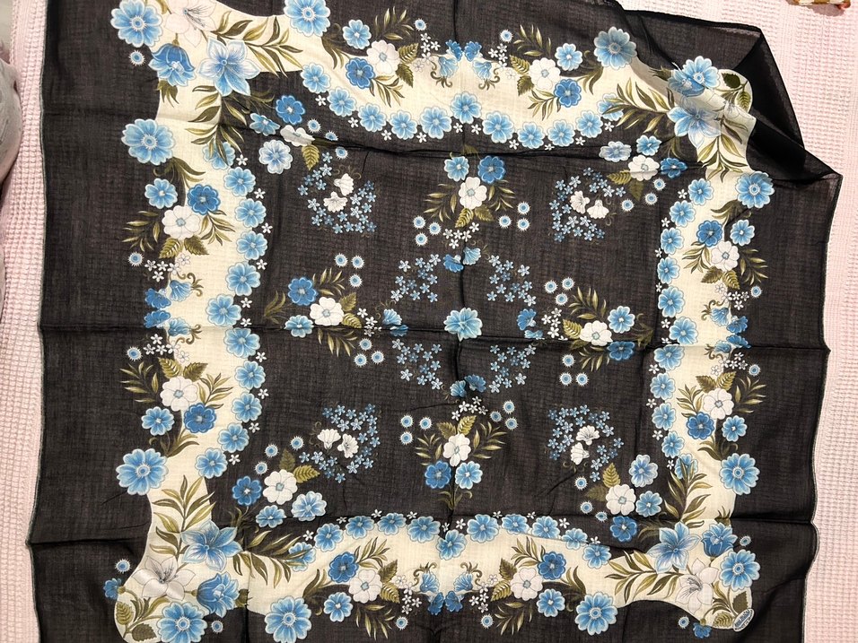 Koyu mavi zemin üzerine açık mavi ve beyaz çiçek desenleri bulunan, dantel detaylı bohem tarzda kadın fular.