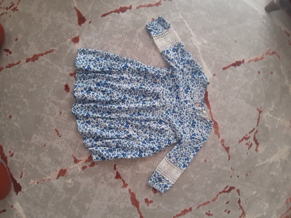 Mavi renk, dantel detaylı, nakışlı çiçek desenli, uzun kollu, V yakalı, bol kesim bohem tarzı kız elbisesi.