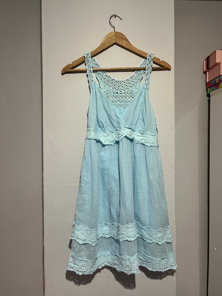 V yaka, ince askılı, dantel detaylı mavi bohem midi elbise. Gevşek kesim, pastel tonlarda ve triko kumaştan, günlük kullanıma uygun. Marka temsilidir %100 pamuk ihracat ürün sıfır