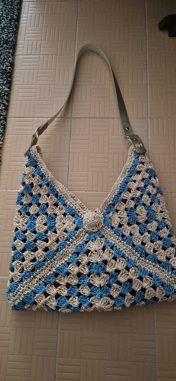 Mavi ve gri tonlarda dantel detaylı örgü bohem tarzda kadın çantası. Desenli yapıya ve ayarlanabilir askıya sahiptir, günlük kullanım için uygundur.
