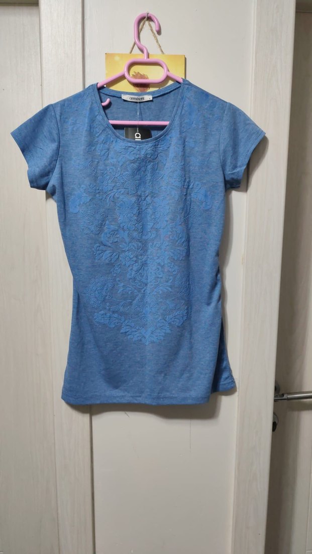 Mavi, kısa kollu, yuvarlak yakalı hamile tişörtü. Dantel detaylı ve baskılı desene sahip, rahat kesimli, günlük kullanıma uygun.