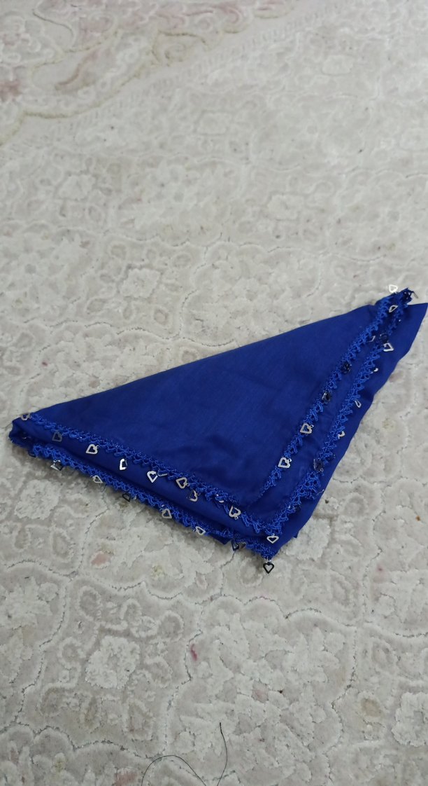 Mavi kadın çeyizlik yazma, dantel kenar detaylı ve yumuşak, sıcak kumaştan yapılmıştır. Rahat ve bohem tarzda, küçük kalp süslemeleri bulunur.