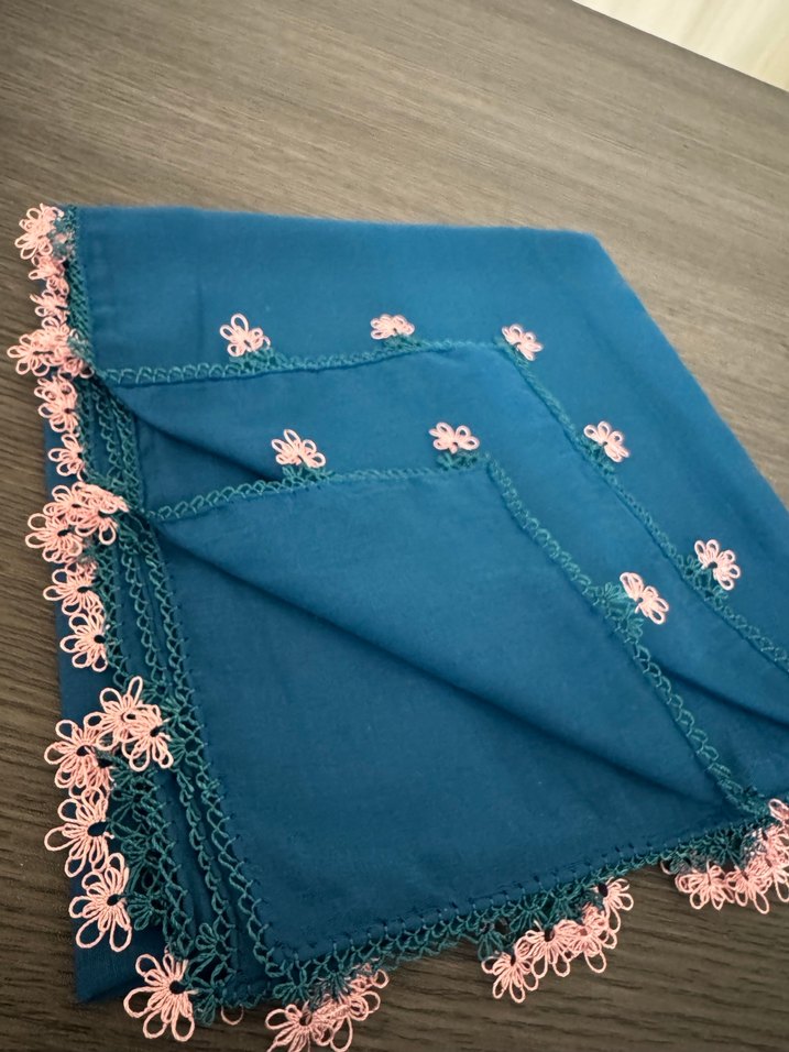 Mavi tekstil fular, dantel kenarları ve küçük dantel çiçek detaylarıyla bohem tarzı yansıtıyor. Pastel tonu yumuşak, retro bir hava katıyor.