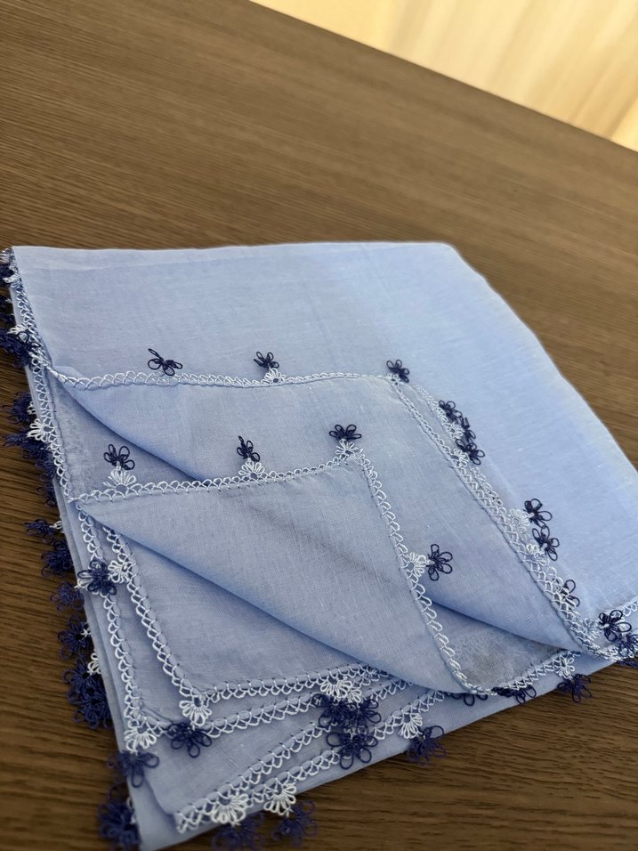 Açık mavi tekstil fular, koyu mavi dantel detaylarıyla bohem ve retro tarzlara uygun klasik tasarım.