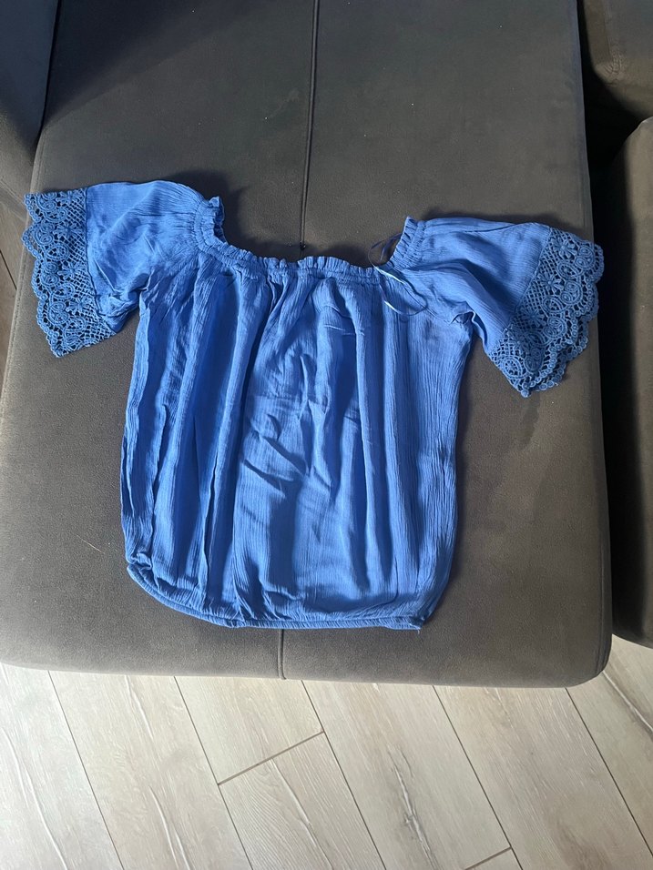 Dantel detaylı kısa kollu, keten kumaştan, mavi renkte, bohem tarzda bol kesim kısa bluz.