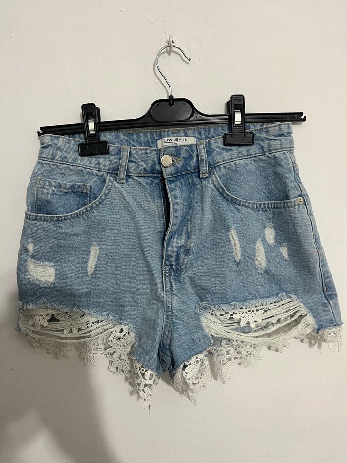 Hafif mavi renkli, dantel detaylı ve nakışlı mini denim şort. Rahat ve bol kesimiyle günlük sokak stiline uygundur.