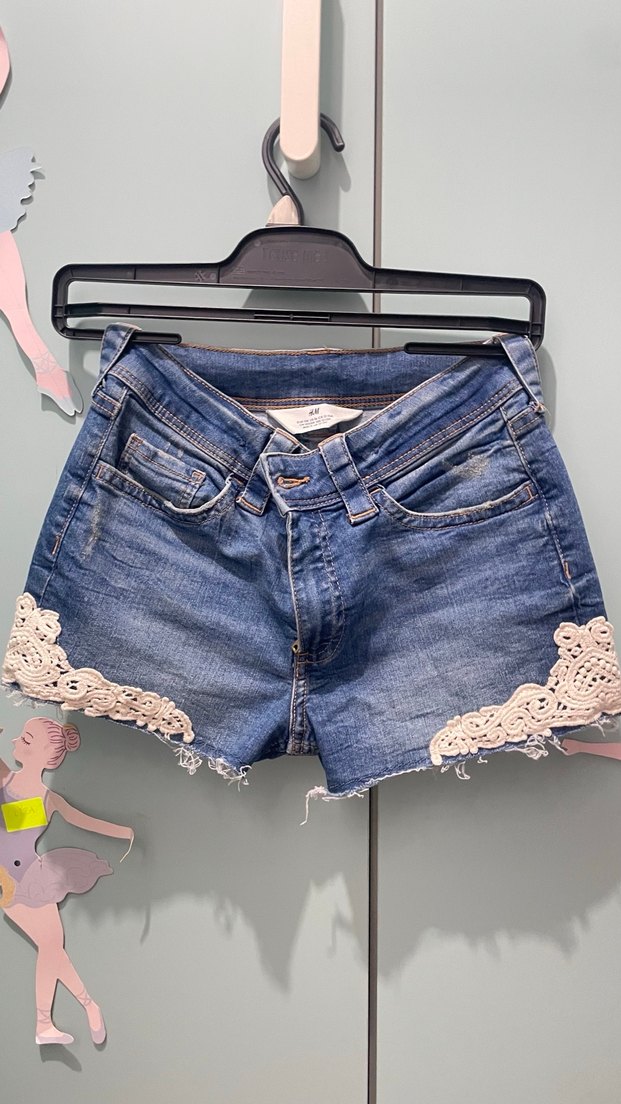 Dantel ve nakış detaylı, açık mavi, dar kesim mini denim şort. Romantik akşamlar için uygun.