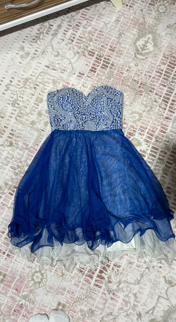 Dantel işlemeli üst kısmı ve desenli tasarımıyla, straplez ve kolsuz, bohem tarzda, fit kesim mavi mini elbise. Parti için uygun. 1 kere giyildi