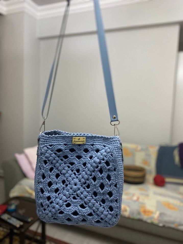 Dantel detaylı mavi örgü kadın çanta, minimal bohem tarzı ve uzun askıya sahip. Yumuşak dokulu, günlük kullanıma uygun.