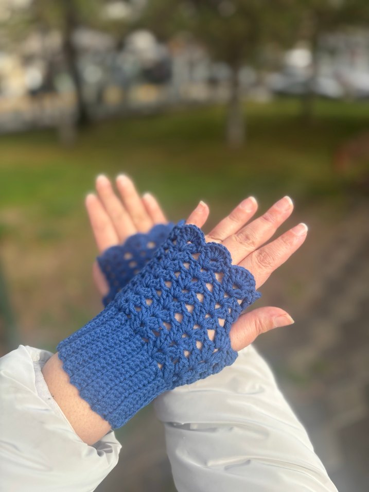 Mavi renkli, dantel detaylı örgü kadın eldiven. Rahat dokusu ve bohem tarzıyla renkli, retro bir görünüm sağlar.