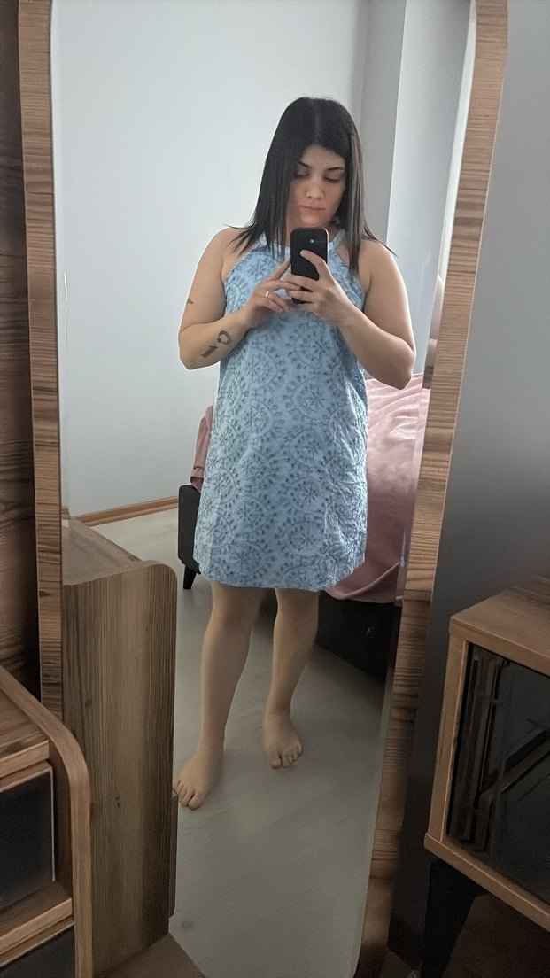 Pastel mavi tonlarda, dantel detaylı, straplez ve salaş kesim midi elbise. Denim kumaştan, günlük rahat kullanıma uygun.