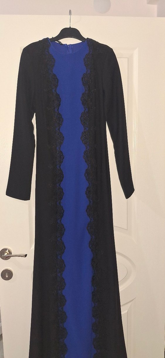 Uzun kollu, koyu mavi renkte gotik elbise. Önde dantel işlemeli, çentikli yaka ve regular kesim, sentetik kumaştan, ofis kullanımı için uygun.