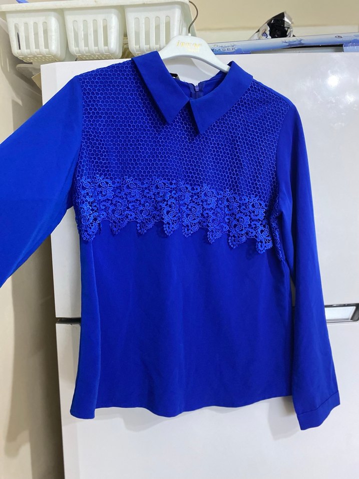 Mavi triko bluz, yaka ve uzun kolludur. Göğüs kısmında dantel detayları bulunur. Rahat kesim ve normal boydadır, ofis kullanımı için uygundur.