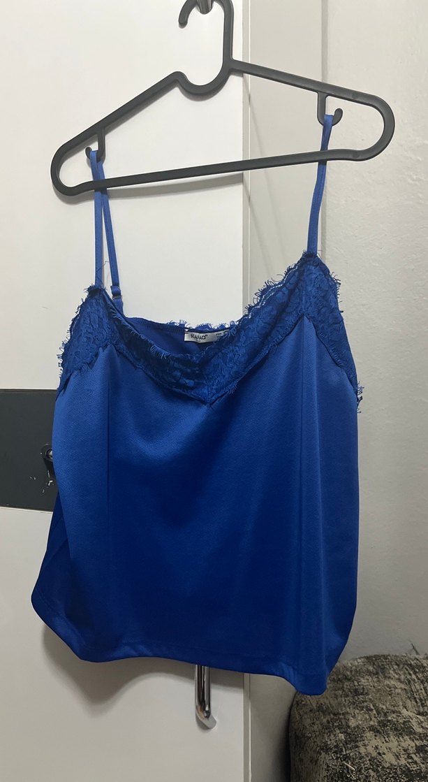 Mavi kadın atlet, ipeksi kumaş ve dantel detaylı V yaka ile. Kolsuz, midi boy ve bol kesim, günlük sokak modasına uygun Paris tarzında. Marka temsili