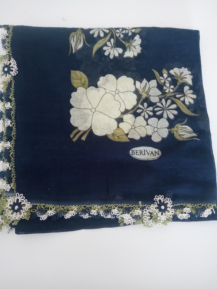 Koyu mavi renkli tekstil kadın fular, dantel kenar detayları ve çiçek desenleriyle vintage tarzını yansıtıyor. Üzerinde "BERIVAN" yazısı bulunur.