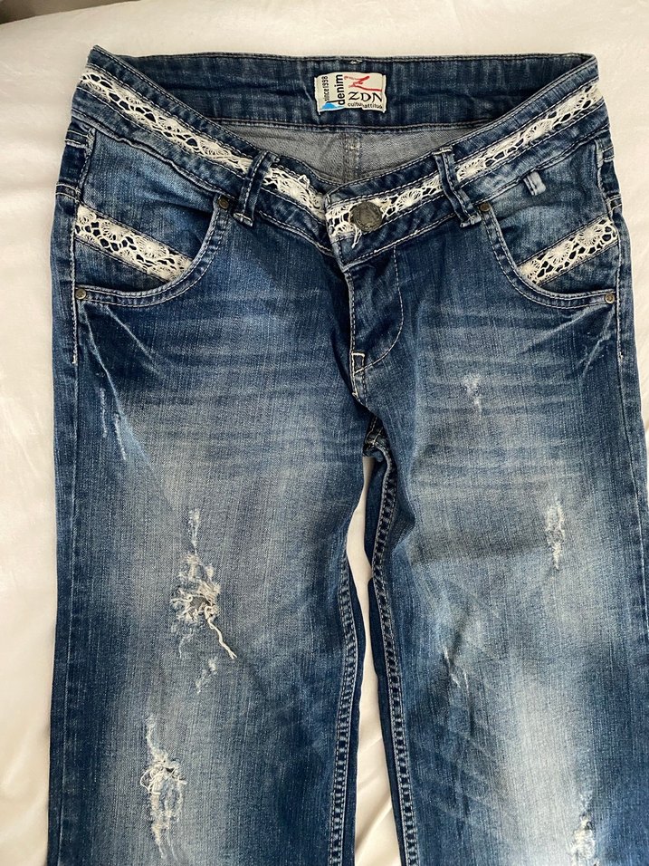 Dantel detaylı, nakışlı desenlere sahip mavi denim jean. Rahat kesim ve normal boyda, günlük sokak stili için uygun.