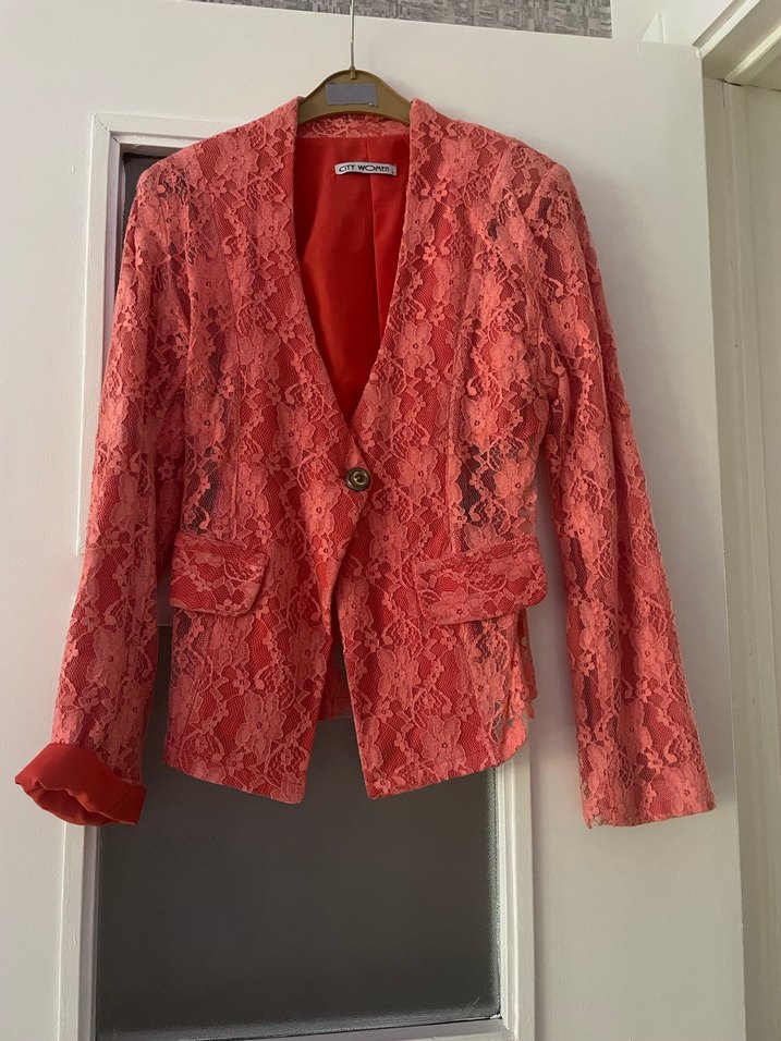 Dantel kaplama ve mercan renkli, yılan desenli kadın ceket. Notlu yaka, uzun kollu, midi boy ve regular fit. Ofis için bohem retro tarzında şık parça.
