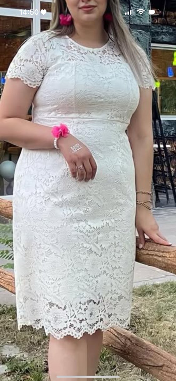 Dantel işlemeli, kısa kollu, kruvaze yakalı beyaz midi elbise. Modern klasik Paris tarzında, düğünler için uygun, vücuda oturan kesim. İç göstermez astarlıdır. Çok güzeldir nikah da giyildi.