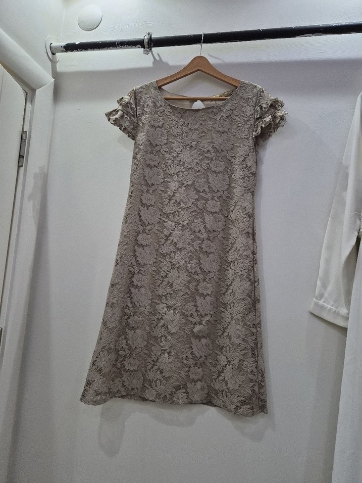 Bej renkte, dantel detaylı midi boyda, kısa kollu ve düz kesim bohem tarzda elbise. Yuvarlak yaka ile klasik şıklık sunar.