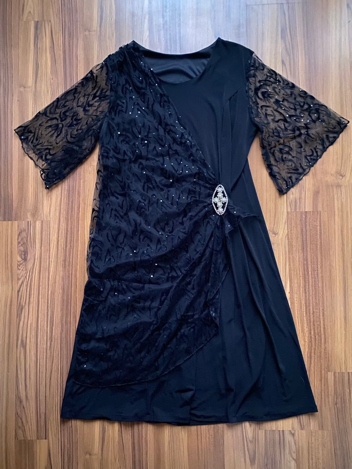 Kollarında ve üzerinde dantel işleme olan, kenardan taşlı broşlu, yuvarlak yaka siyah elbise.