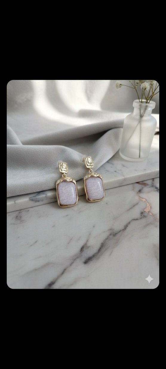 Modern ve minimalist hatlara sahip, vintage dokunuşlu dikdörtgen form. ✨Yüksek kaliteli metal üzerine altın rengi kaplama. Kararmaya karşı dayanıklıdır. ✨Orta kısımda lavanta/pembe tonlarında, çatlatma desenli özel taş efekti kullanılmıştır.