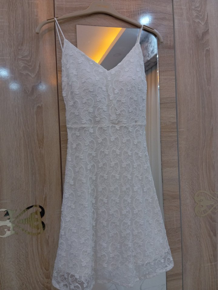 İnce askılı, V yaka ve dantel detaylı mini beyaz gelinlik. Bohem tarzda, vücuda oturan kesimi ve midi boyuyla klasik şıklık sunar.