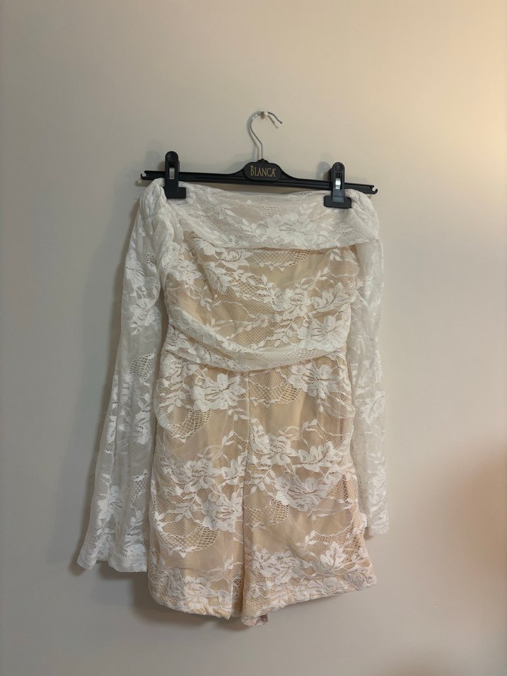 Dantel detaylı, straplez mini beyaz tulum, vücuda oturan kesimiyle düğünler için uygun. Bohem tarzda, klasik şıklık sunar.