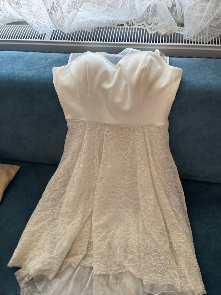 Düz üst kısmı ve dantel etek detaylarıyla elbise nikah elbisesi hic giyilmedi baza altinda durdugu icin hafif sararmalar var makinada veya kuru temizlemede cikar diye dusunuyorum