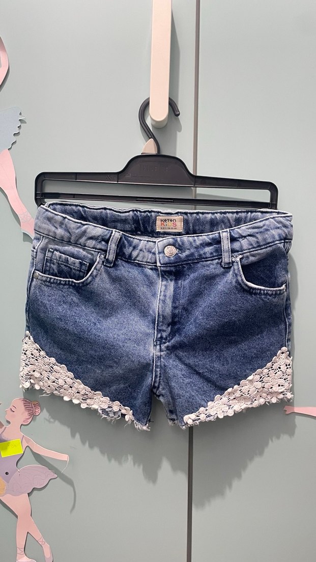 Nakışlı desenler ve dantel detaylı, fitted kesim mini mavi denim şort. Günlük sokak stiline uygun rahat ve şık.