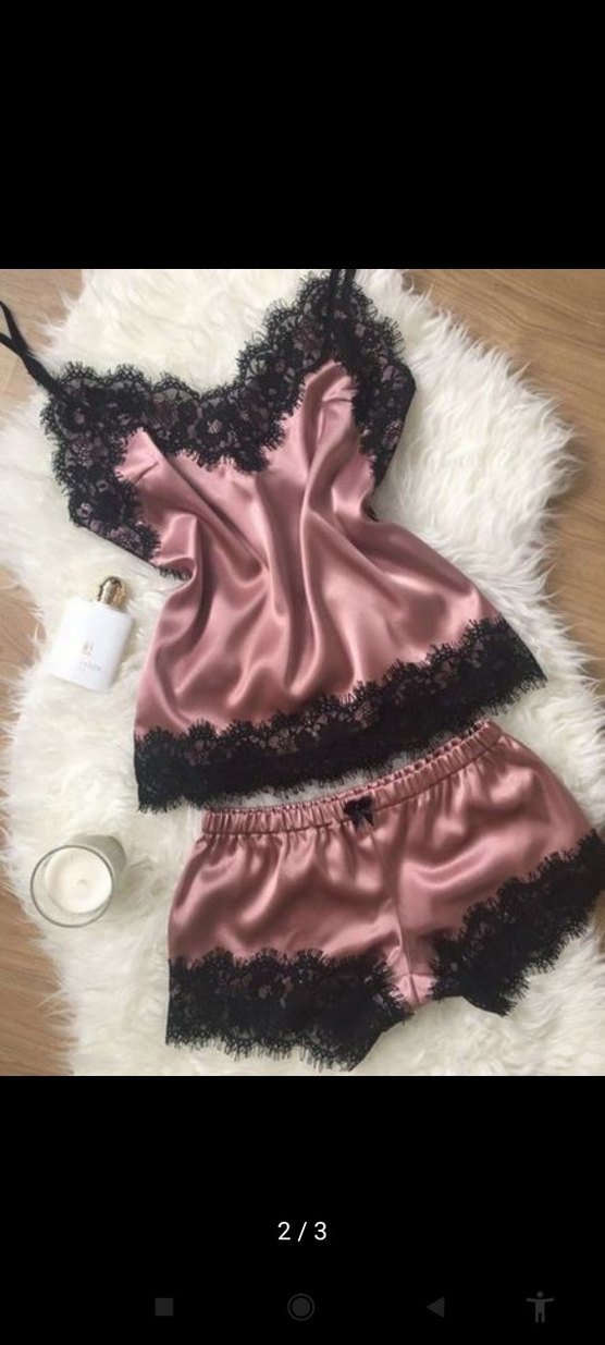 Koyu pembe saten ve siyah dantel detaylı, kısa ve askılı, vücuda oturan kadın pijama takımı. Rahat ve gotik tarzda.