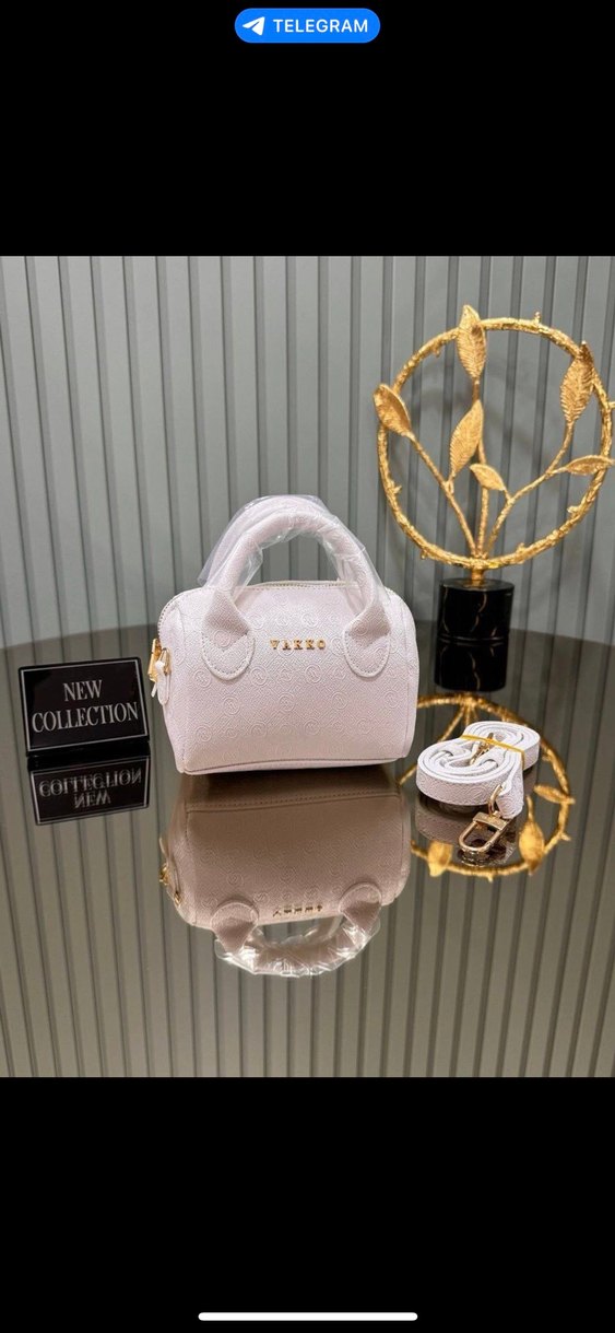 Dantel detaylı, baskılı desene sahip beyaz sentetik kumaştan modern klasik kadın çantası. Çıkarılabilir askı ile birlikte. "NEW COLLECTION" yazılıdır.