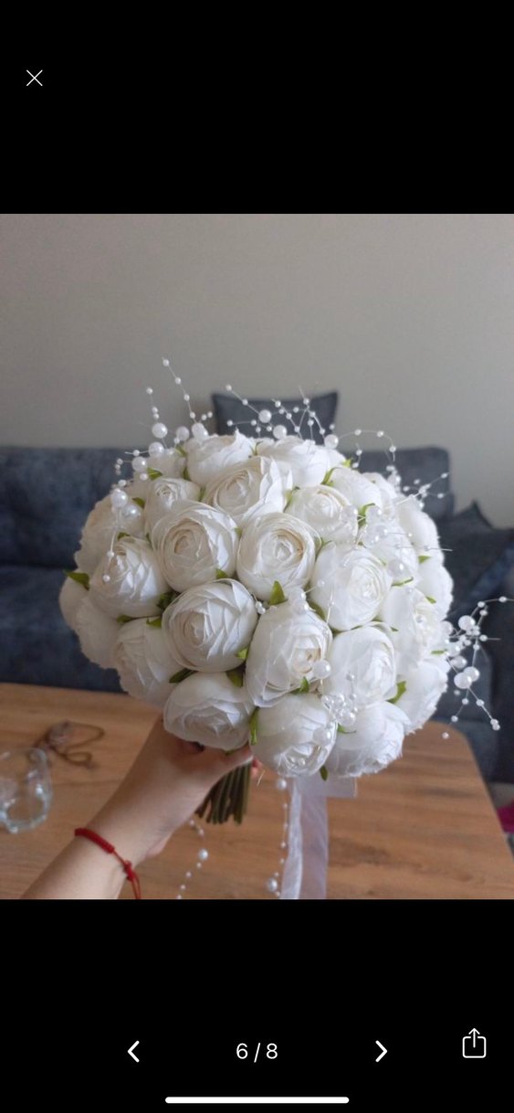 Dantel detaylı, modern klasik tasarıma sahip beyaz gelin buketi, minimal ve zarif düğün tarzına uygundur.