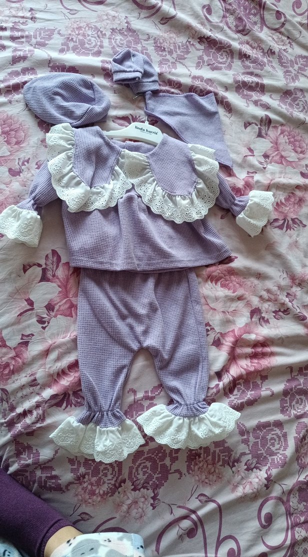 Pastel mor renkte, uzun kollu ve yakada, manşetlerde ile pantolonda dantel detayları bulunan bebek kız takımı. Yumuşak kumaştan, konforlu kullanım sağlar. Şapka dahil. HİÇ KULLANILMADI.