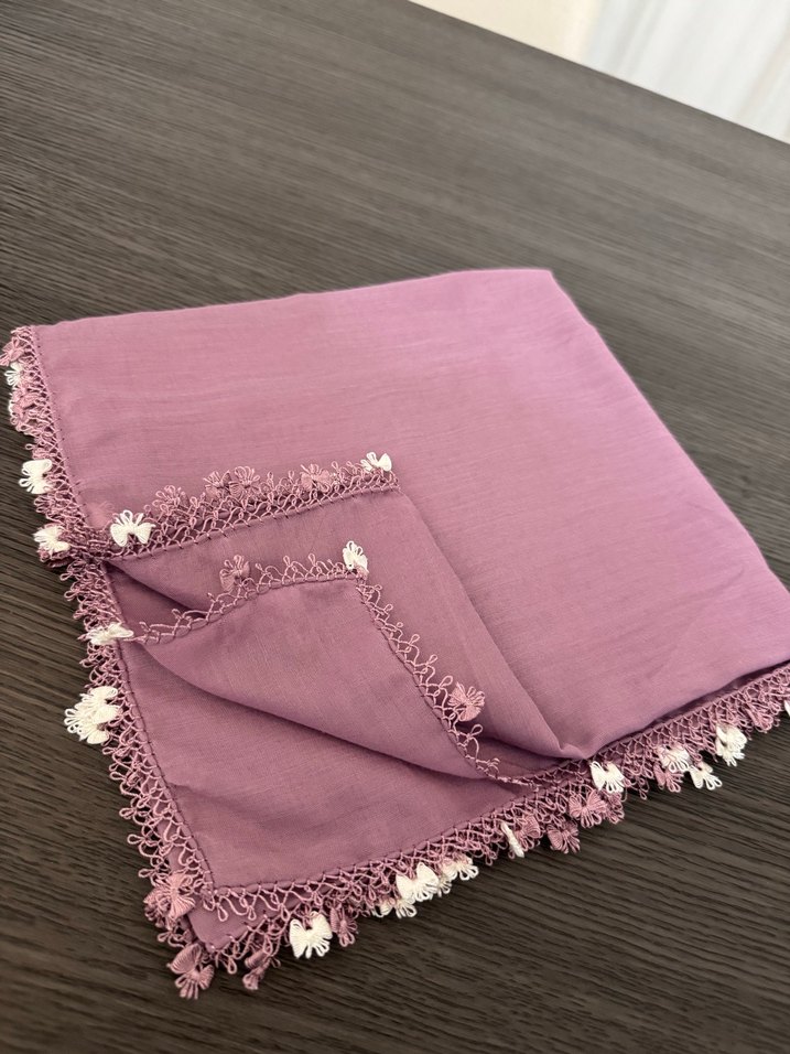 Mor renkli, dokuma kumaştan yapılmış bu fular, dantel ve küçük beyaz çiçek detaylarıyla bohem ve retro bir görünüm sunar. Pastel tonlarıyla rahat bir tarz sağlar.