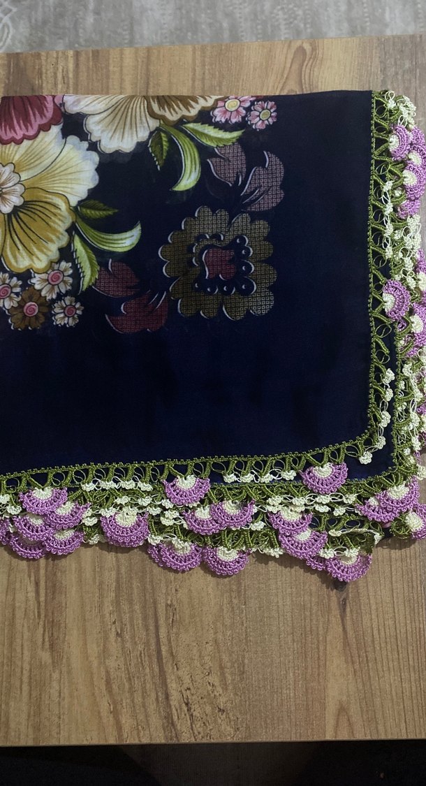 Kadınlar için mor tonlarında çiçek desenli tekstil kumaştan yapılmış, yeşil ve mor dantel detaylı bohem tarzda fular.