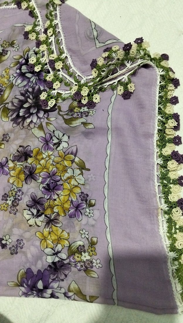 Pastel mor renkte, dantel kenarları ve çiçek desenleri bulunan, yumuşak dokulu bohem ve retro tarzda kadın fularıdır.