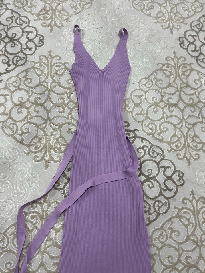 V yaka, dantel ve nakış detaylı, mor renkli bohem uzun elbise. İnce ve vücuda oturan kesimiyle düğünler için uygun, kolsuz ve yumuşak sentetik kumaştan.