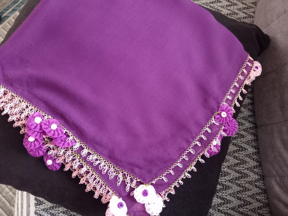 Parlak mor ipek kumaştan, dantel kenar detaylı ve çiçek süslemeli bohem tarzı kadın fular.