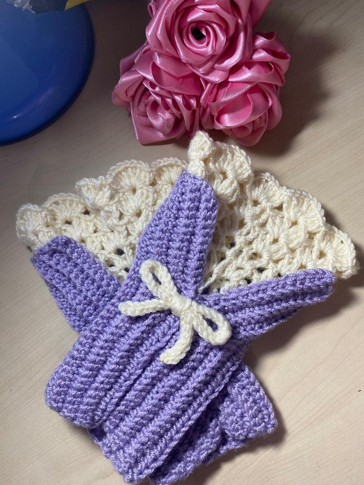 Pastel mor renkli, dantel detaylı ve fiyonk süslemeli örgü kadın eldiveni. Rahat ve bohem tarzı bir arada sunar. kullanılmamıştır