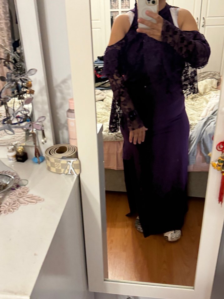 Dantel detaylı, uzun ve mor renkli bu abiye elbise, soğuk omuz kesimlerine sahip uzun kolludur. Straplez yakasıyla gotik tarzda düğünler için uygundur.