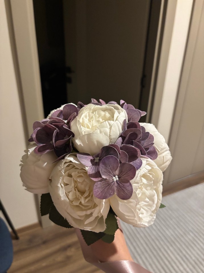 Dantel detaylı, bohem tarzda beyaz ve mor çiçeklerden oluşan klasik zarif gelin buketi. Ben mağazadan alıp düğünümde kullandım. Tertemiz hiçbir şey olmadı.