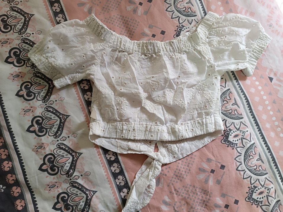 Pamuklu beyaz bluz, nakış ve dantel detaylarına sahip. Askılı kısa kollu, straplez yaka ve bol kesim bohem tarzda. Mini boy ve bağcıklı ön detay içerir.