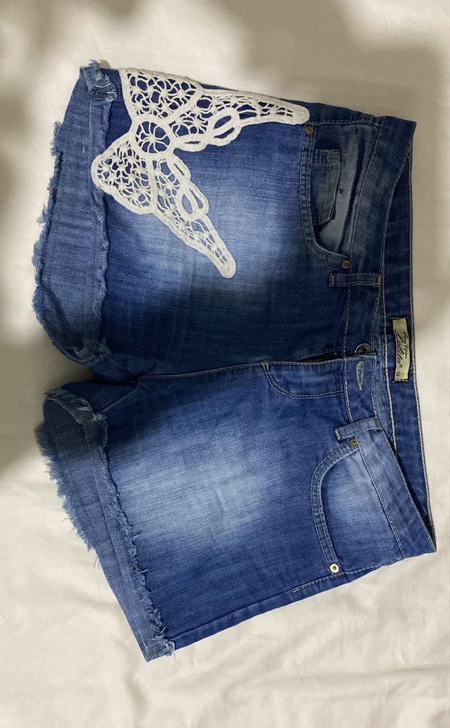 Açık mavi kot şort, nakışlı desenler ve dantel detaylıdır. Rahat kesim, kısa ve kıvrık etek ucu ile bohem tarzda günlük kullanıma uygun.