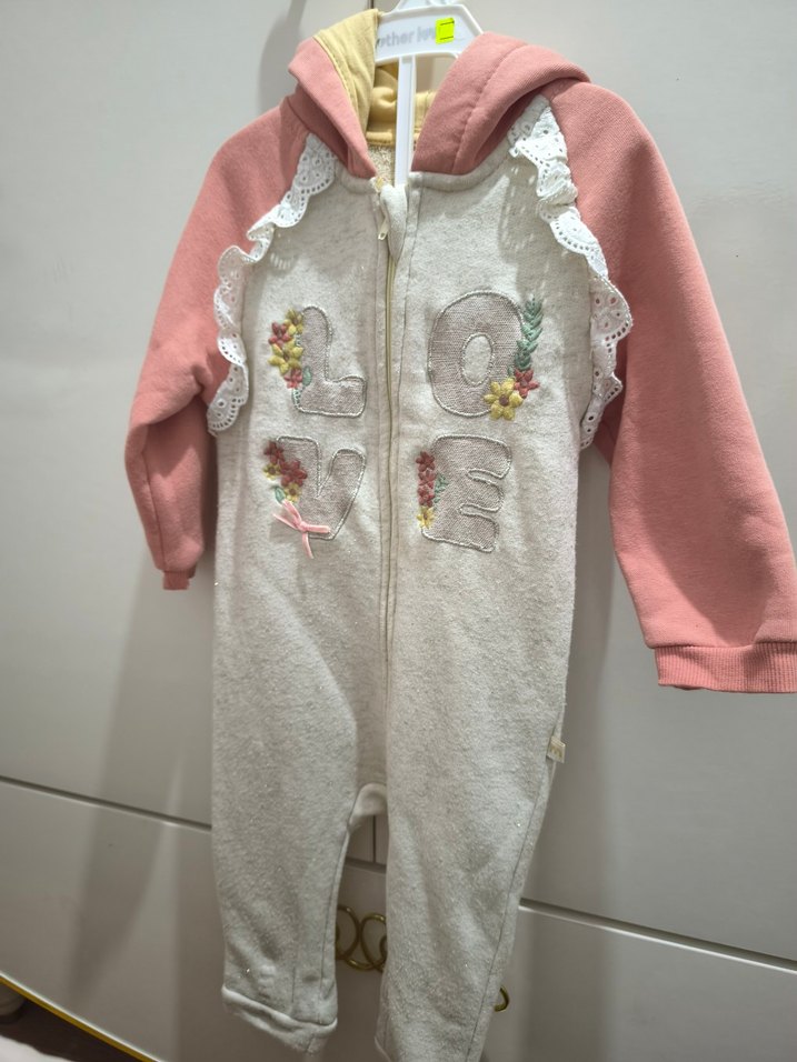 Pastel pembe renkte, nakışlı çiçek desenleri ve ön tarafında dantel detayları bulunan kapüşonlu bebek tulumu. Önden fermuarlı.