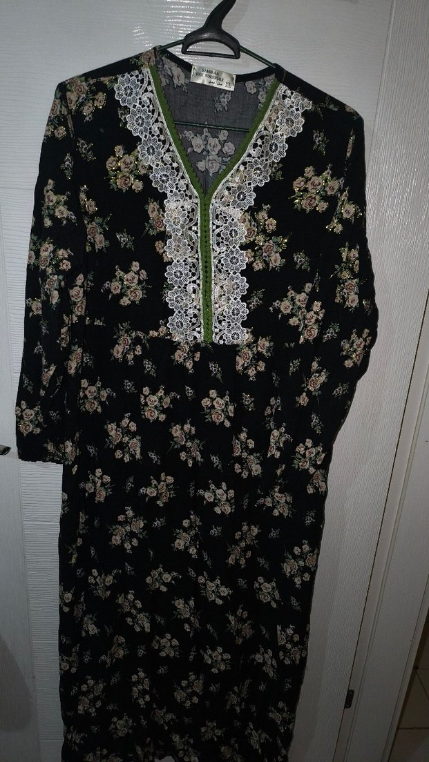 Nakışlı çiçek desenleri ve V-yaka etrafında dantel detayları bulunan siyah uzun elbise. Bol kesim ve uzun kolludur, bohem tarzı yansıtır.