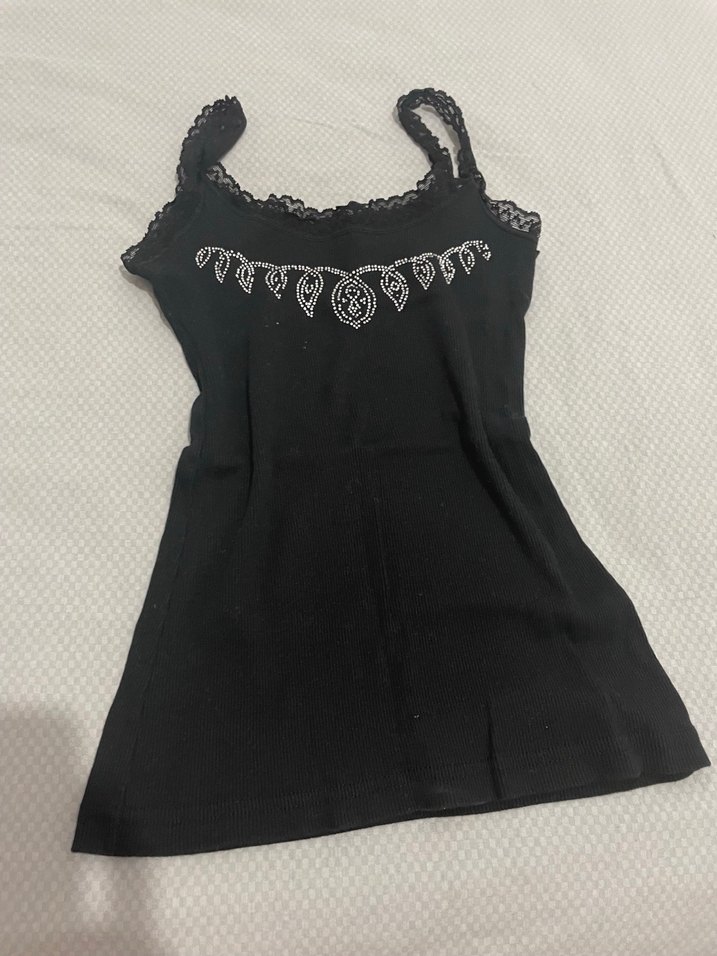 Dantel detaylı ve nakışlı siyah triko atlet, straplez tarzda ve midi boyda. Fitted kesimiyle goth parti kombinlerine uygundur.