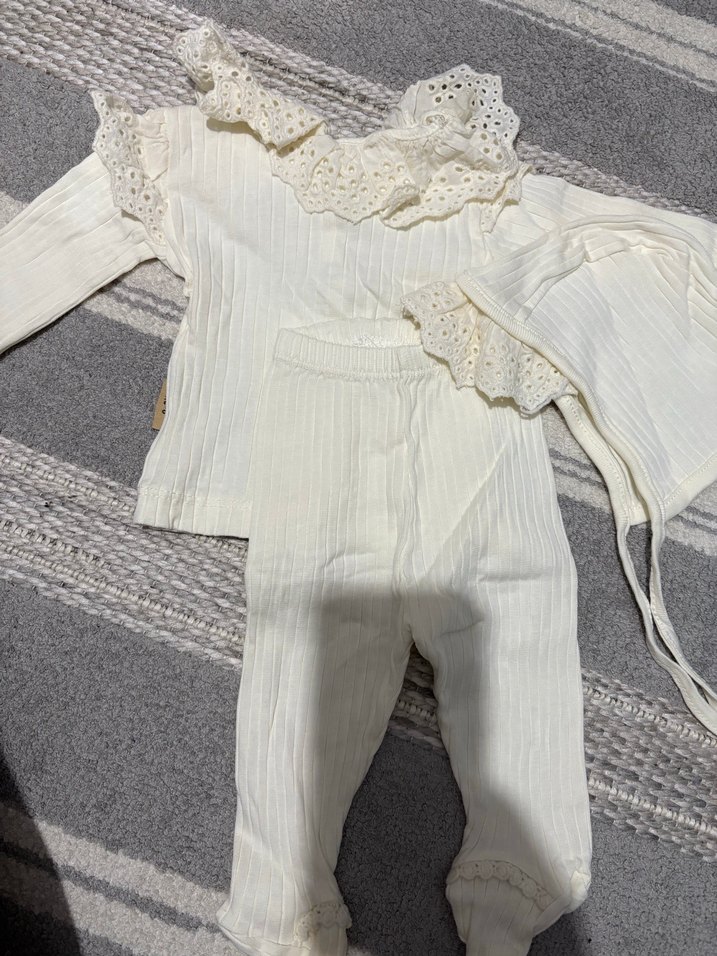Bir çıtçıtında soyulma var sadece. Ojeyle felan boyanabilir. Uzun kollu, dantel detaylı ve yumuşak dokulu beyaz bebek kız takımı. Üst, pantolon ve uyumlu başlık içerir.