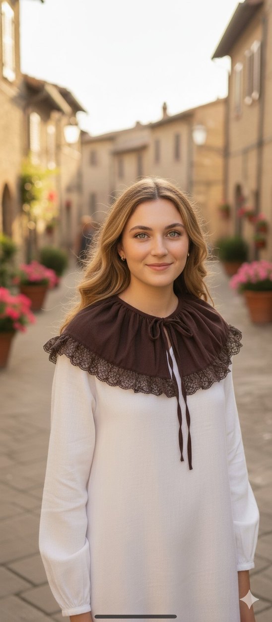 Dantel detaylı, koyu bej renkli örgü boyunluk. Bohem ve gotik stilini yansıtan, bağcıklı rahat tasarım.
